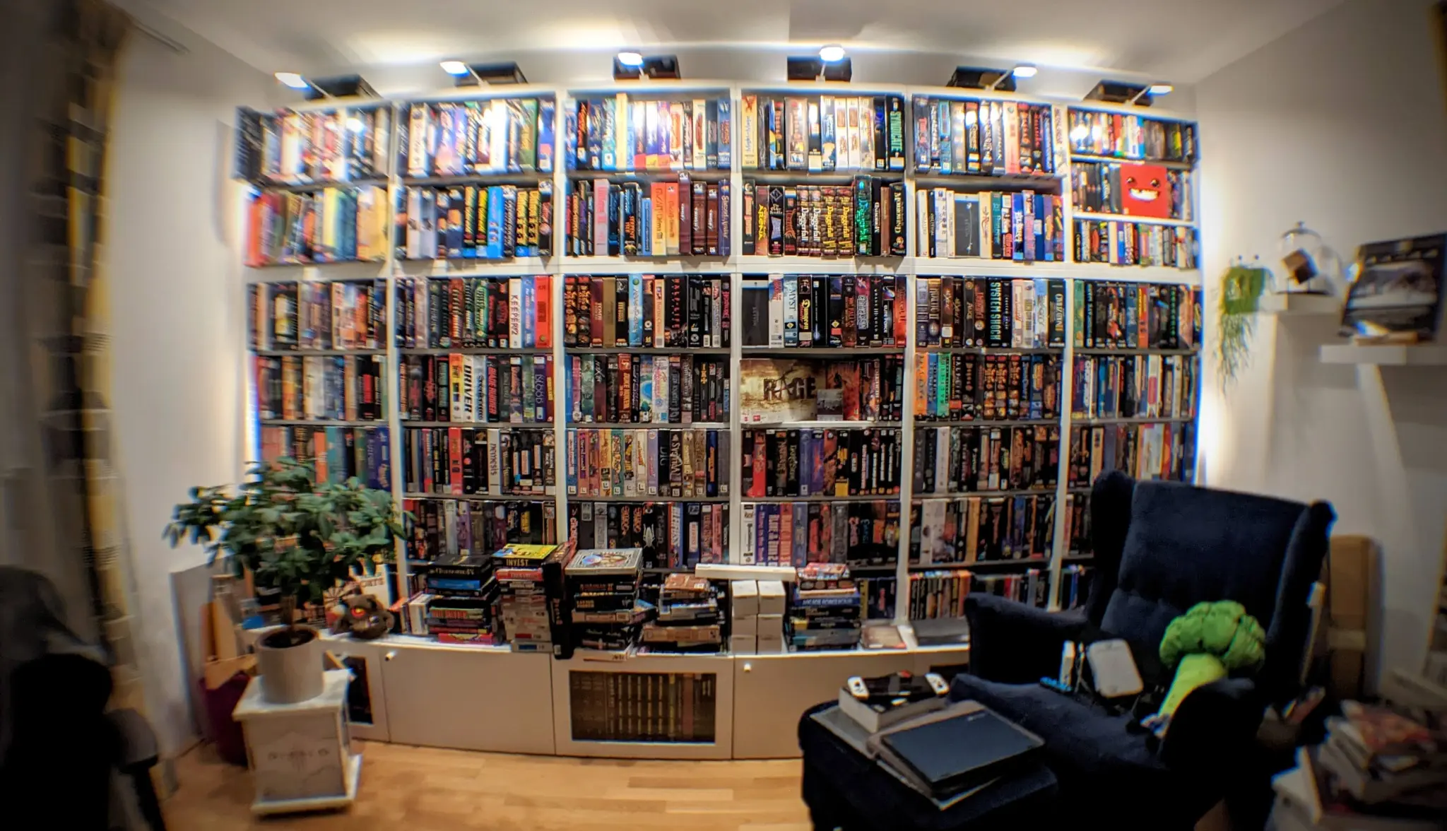 A 207 megapixel panorama of the shelf behind me taken in October 2021. There's no real order to the games on the shelf, except grouping some series. Why? It keeps browsing fun, even for me when looking for a specific box. Further, bigger boxes (e.g. US releases) are in the top, while the standardized Euroboxes fit in perfectly in the lower rows. The wall is 3.6m x 2.28m x 0.2m (bottom row 0.4m) and — you've guessed it — it's all IKEA (Bestå)