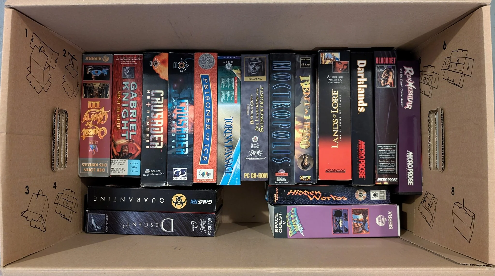 In regard of fidelity, 723 out of the 950 boxes have all six sides scanned. I'm working on adding more but this comes down to finding the time needed for scanning and editing. There's also 75 boxes with a gatefold cover that can be flipped open by double-clicking the box. Also, 136 boxes do have specific textures for their reflectiveness. It's a subtl effect but IMHO worth all the work, just look at Morrowind or Beneath a Steel Sky.