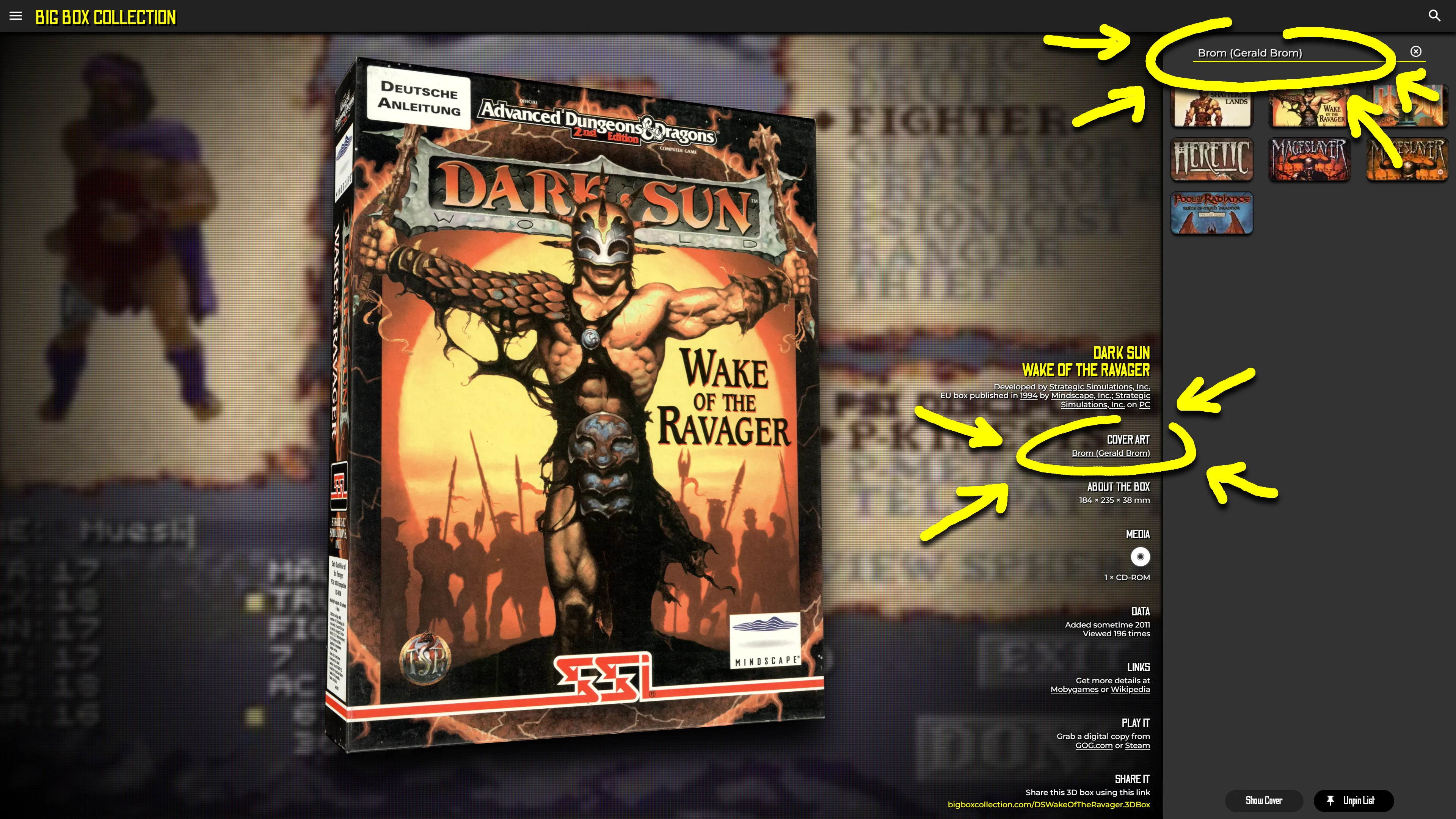 If added to the database, there's a new "Box art" info; searching for an artist is also possible, either bei entering a name or by clicking on a listed "Box art" info.