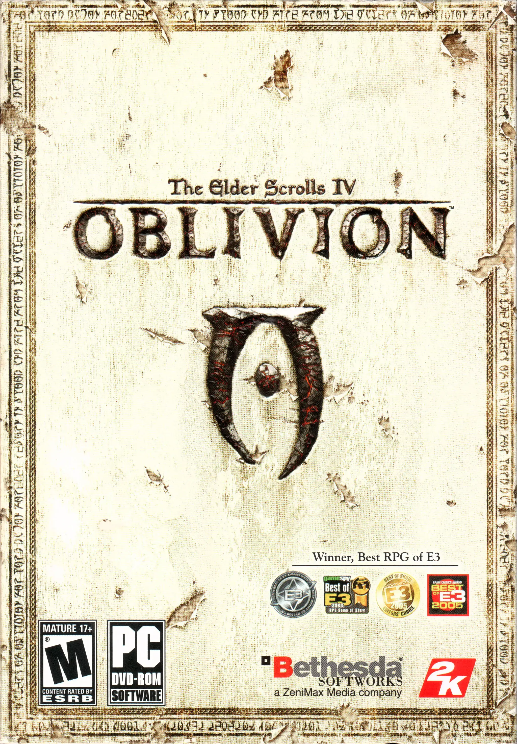 Photo of the content of The Elder Scrolls IV: Oblivion (2006, PC, US); developed by Bethesda Game Studios, published by 2K Games, Inc.; Bethesda Softworks LLC; Hi-res 3D box available at https://bigboxcollection.com