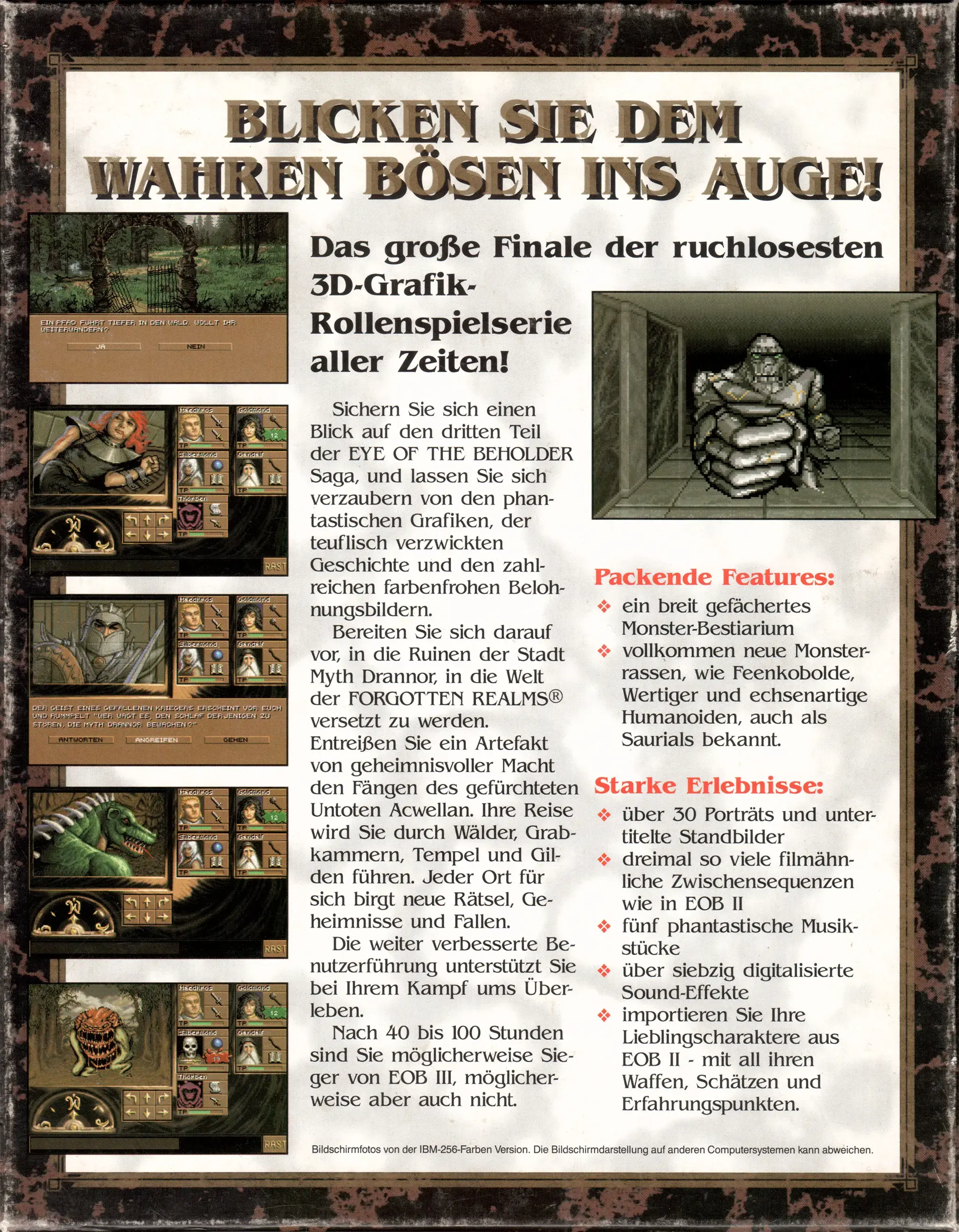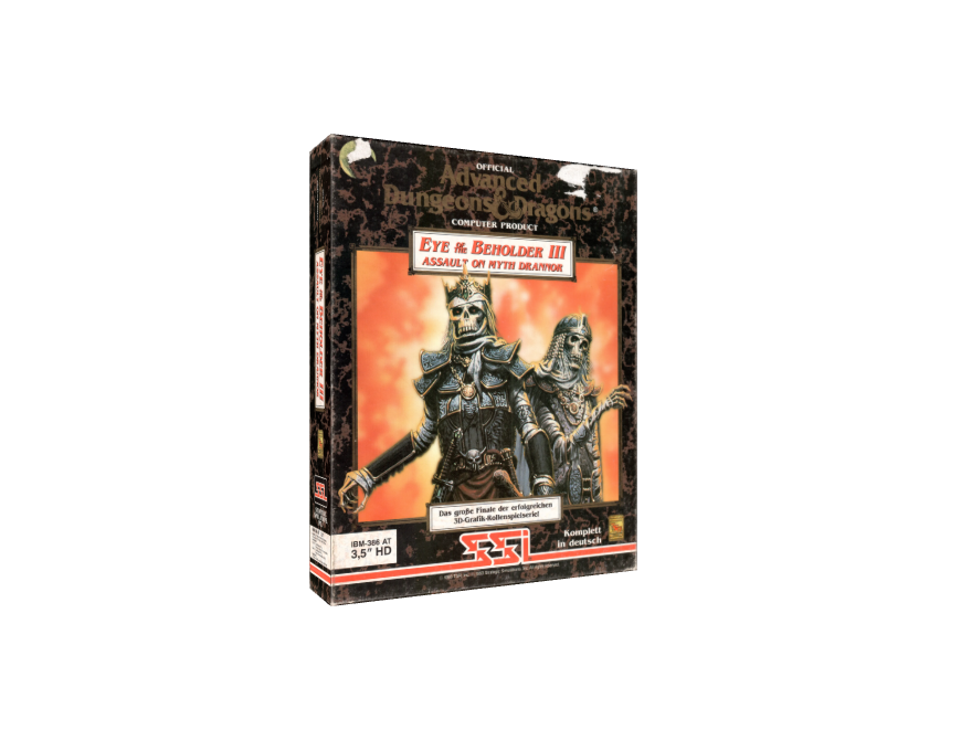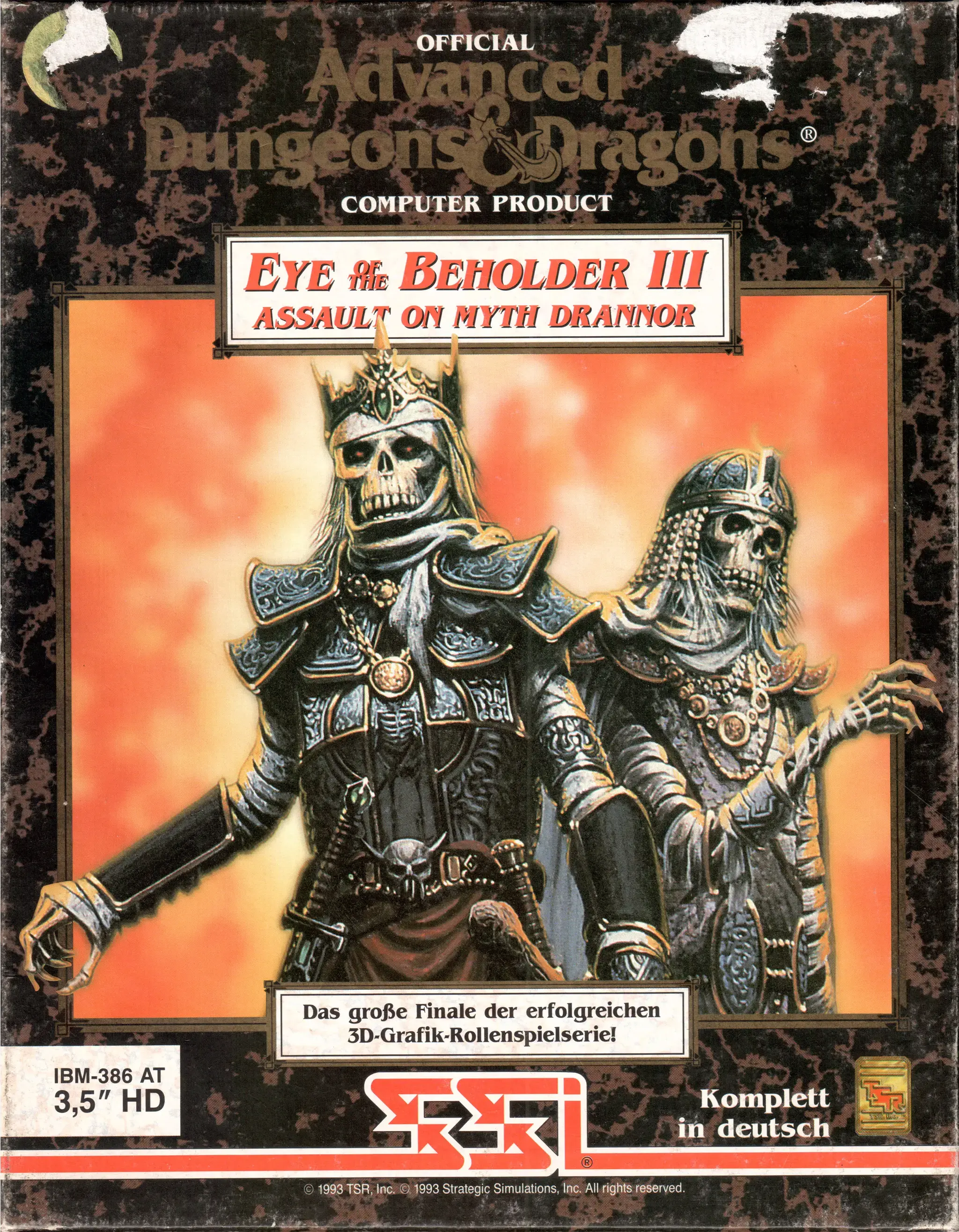 Photo of the content of Eye of the Beholder III: Assault on Myth Drannor (1993, PC, DE); developed by Strategic Simulations, Inc., published by Softgold Computerspiele GmbH; Hi-res 3D box available at https://bigboxcollection.com