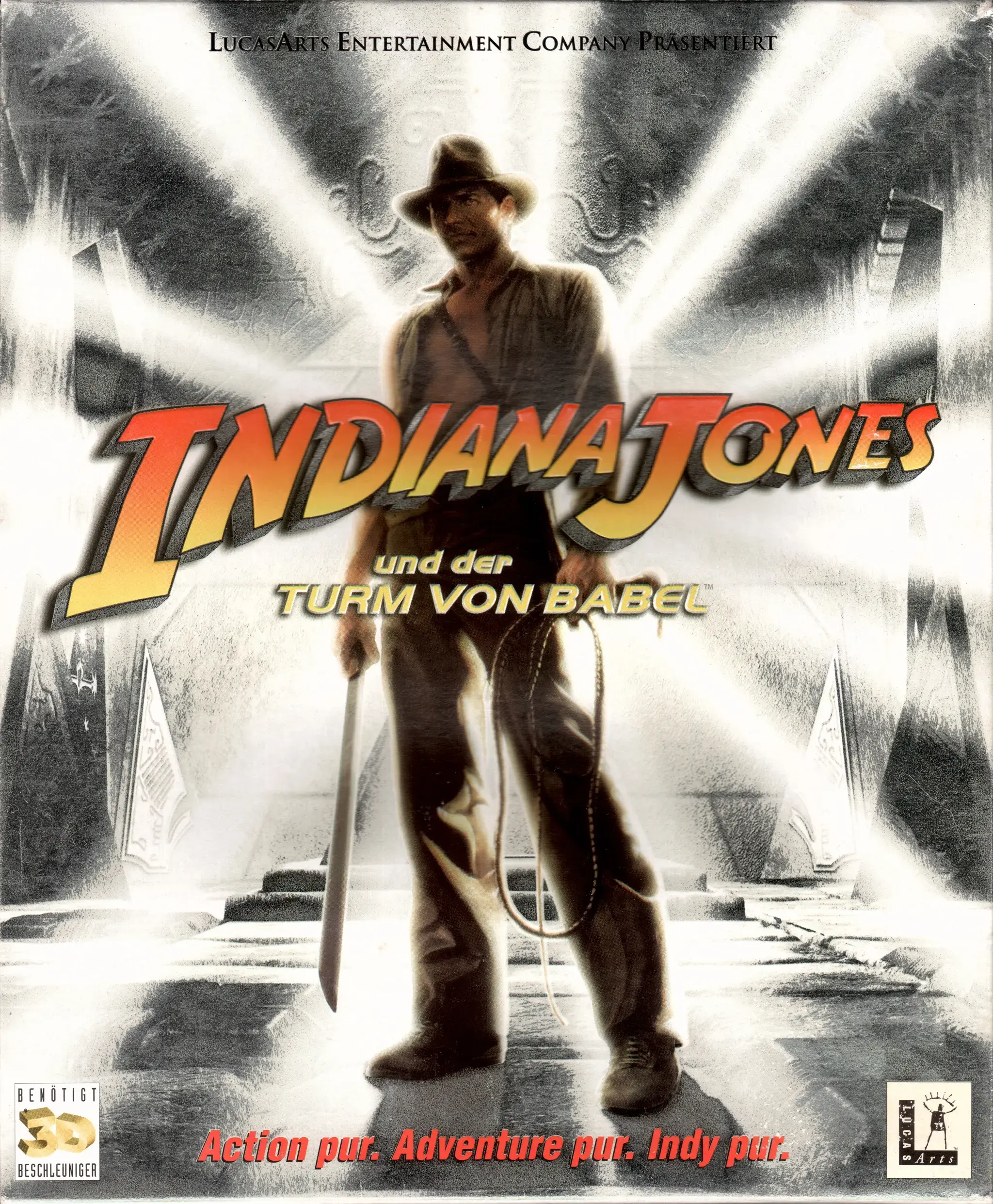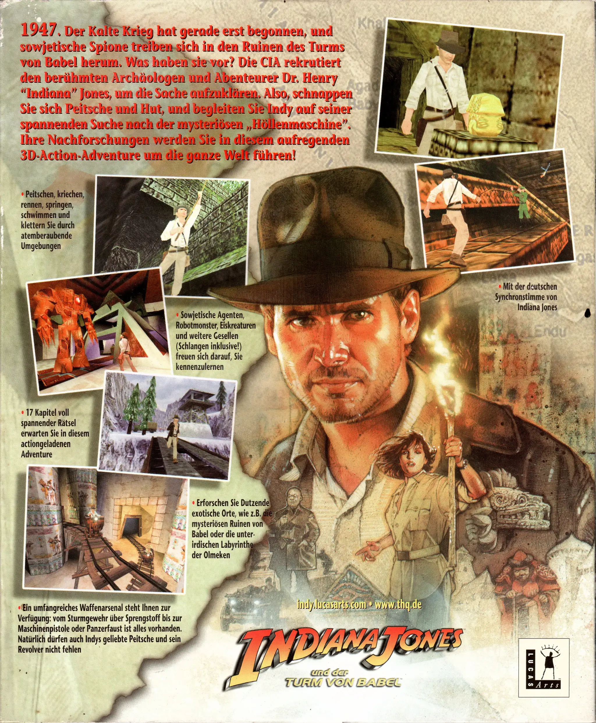 Photo of the content of Indiana Jones and the Infernal Machine (1999, PC, DE); developed by LucasArts Entertainment Company LLC, published by LucasArts Entertainment Company LLC; Hi-res 3D box available at https://bigboxcollection.com