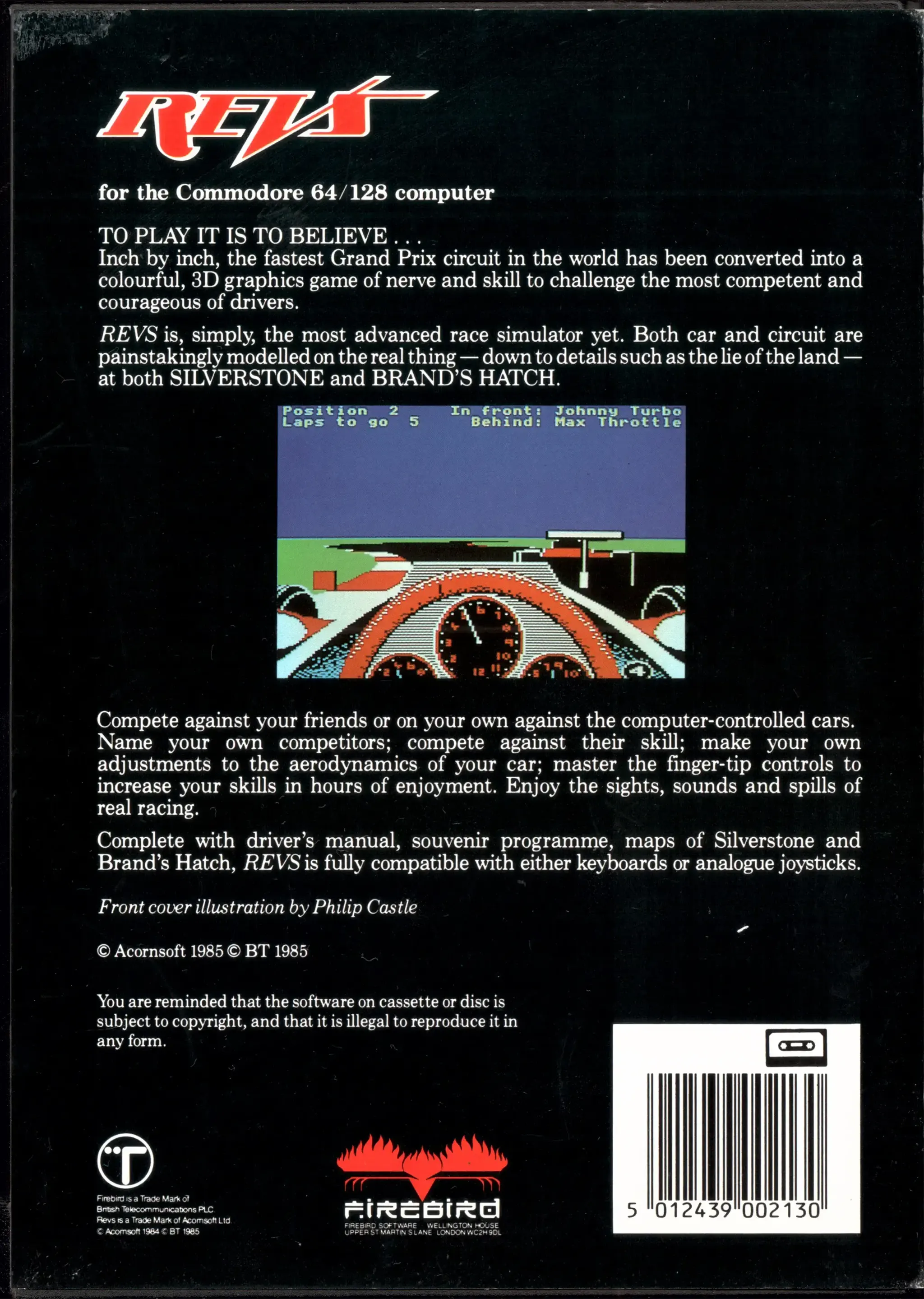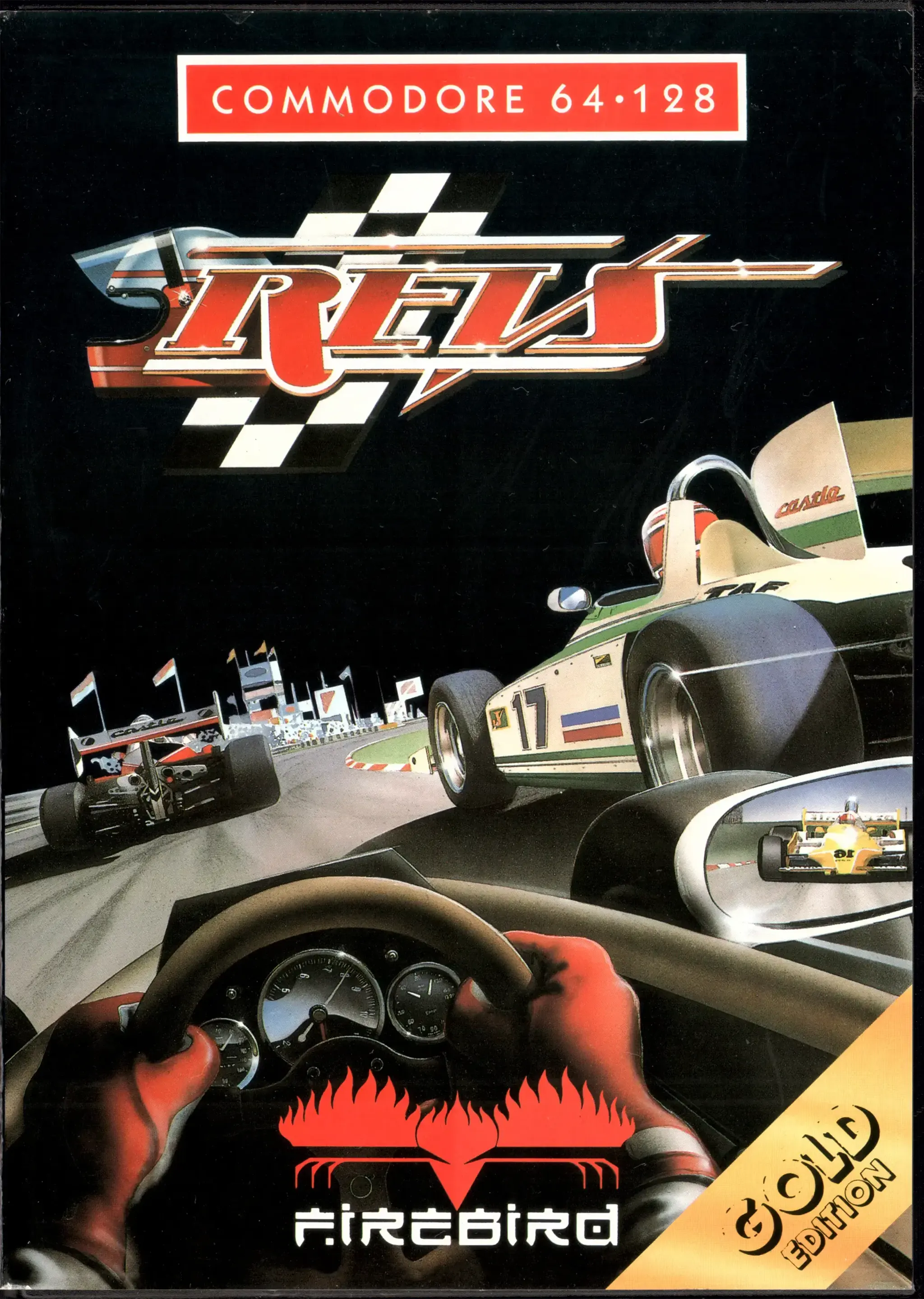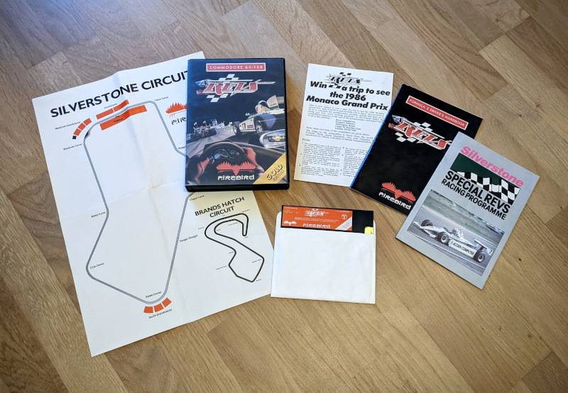 Photo of the content of Revs (1986, C64, UK, Gold Edition); developed by Geoffrey J. Crammond, published by Firebird Software; Hi-res 3D box available at https://bigboxcollection.com
